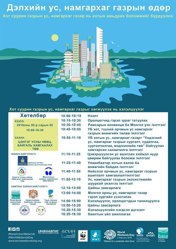 Монгол улс “Олон улсын ач холбогдол бүхий ус, намгархаг газар ялангуяа усны шувууд олноор амьдардаг орчны тухай конвенц” /РАМСАР/-т нэгдэн орсноос хойш жил бүрийн 02 дугаар сарын 02-ны өдрийг “Дэлхийн ус намгархаг газрын өдөр” болгон тэмдэглэн өнгөрүүлдэг билээ. Энэ жил Дэлхийн ус намгархаг газрын өдөр болон Ус намгархаг газрын тухай талуудын 13 дугаар бага хурлыг /COP13/ олон улсын хэмжээнд “Ус намгархаг газраас хотын тогтвортой хөгжил” уриан дор тэмдэглэн өнгөрүүлэх гэж байна.