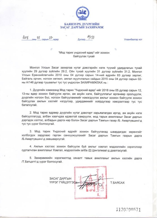 Монгол Улсын Ерөнхийлөгчийн Зарлигаар жил бүрийн 5, 10 дугаар сарын хоёр дахь долоо хоногийн Бямба гаригийг ‘’Мод тарих үндэсний өдөр’’ болгосон билээ. Иймд Баянзүрх дүүргийн Засаг дарга Захирамж гаргаж 5 дугаар сарын 12,13-ны өдөр ‘’Мод тарих үндэсний өдөр’’-ийг дүүргийн хэмжээнд зохион байгуулахаар боллоо. Тухайлбал эдгээр өдрүүдэд дүүргийн харьяа хэлтэс албад ‘’Шинжлэх Ухааны Академийн Ерөнхий болон Сорилын Биологийн Хүрээлэнгийн Ботаникийн цэцэрлэг’’-д мод тарих бол Засаг даргын Тамгын газрын ажилтан, албан хаагчид ‘’Баянзүрх хайрхан’’-д мод тарих юм.