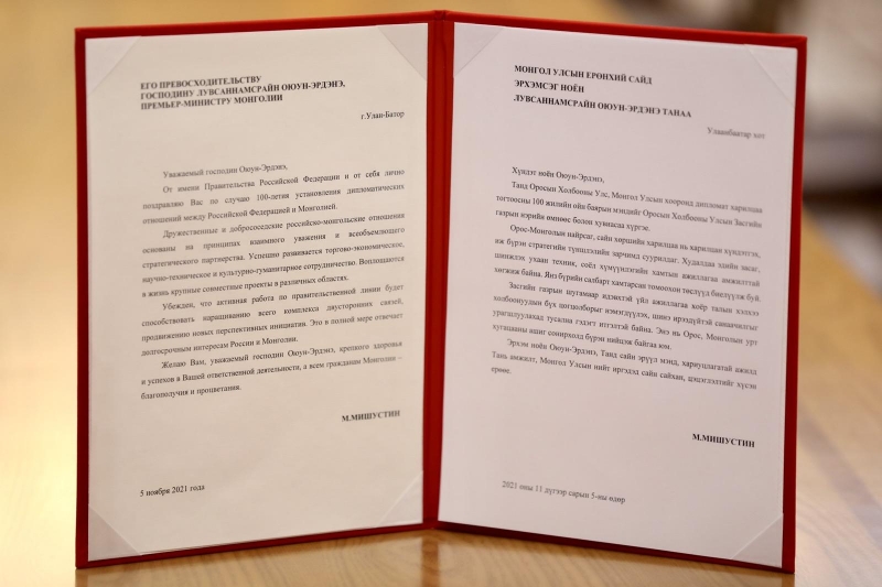 Дипломат харилцаа тогтоосны 100 жилийн ойг тохиолдуулан ОХУ-ын Засгийн газрын дарга М.В.Мишустинаас Монгол Улсын Ерөнхий сайд Л.Оюун-Эрдэнэд илгээсэн мэндчилгээг ноён К.И.Косачёв уламжлав.