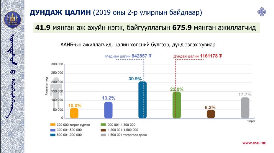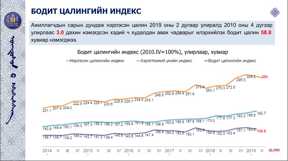 Ажиллагчдын сарын дундаж нэрлэсэн цалин 2019 оны хоёрдугаар улиралд 2010 оны дөрөвдүгээр улирлаас гурав дахин нэмэгдсэн хэдий ч худалдан авах чадварыг илэрхийлэх бодит цалин 58.8 хувиар нэмэгджээ. Судалгаанд нийт 41.9 мянган ААН, байгууллагын 675.9 мянган ажиллагчдын цалингийн үзүүлэлтийг хамруулсан байна.