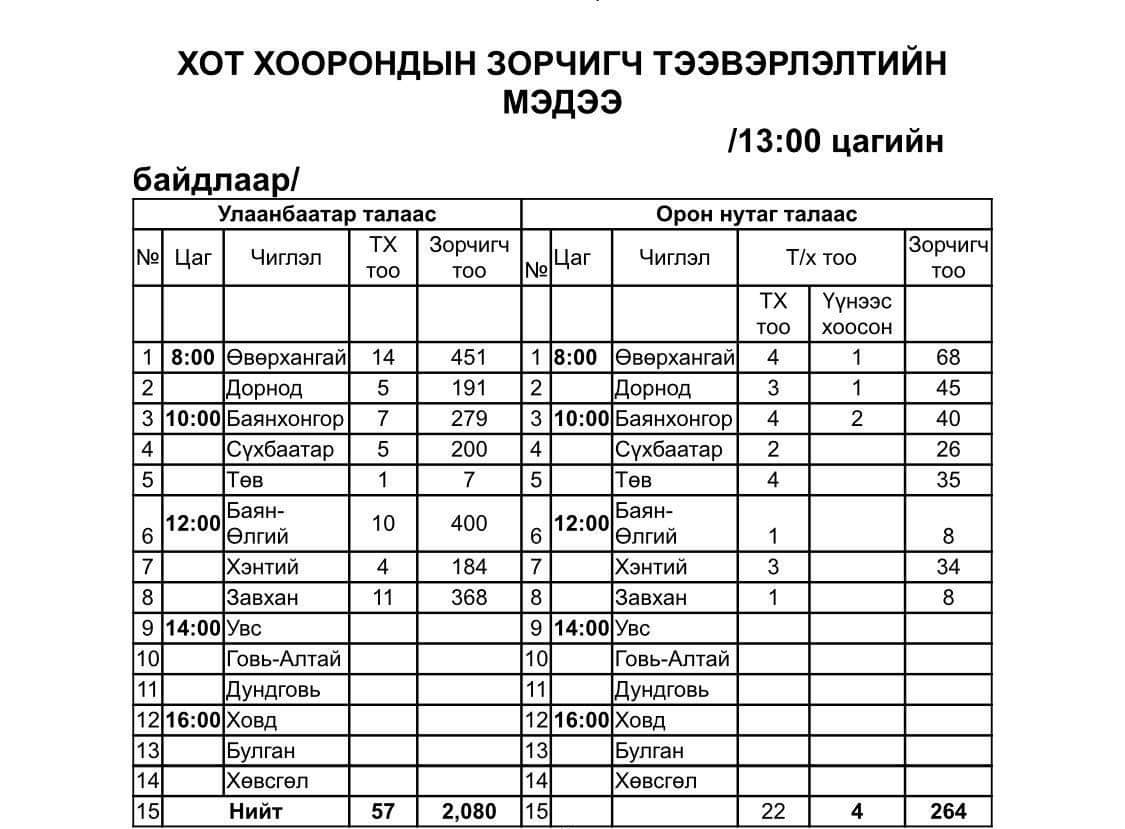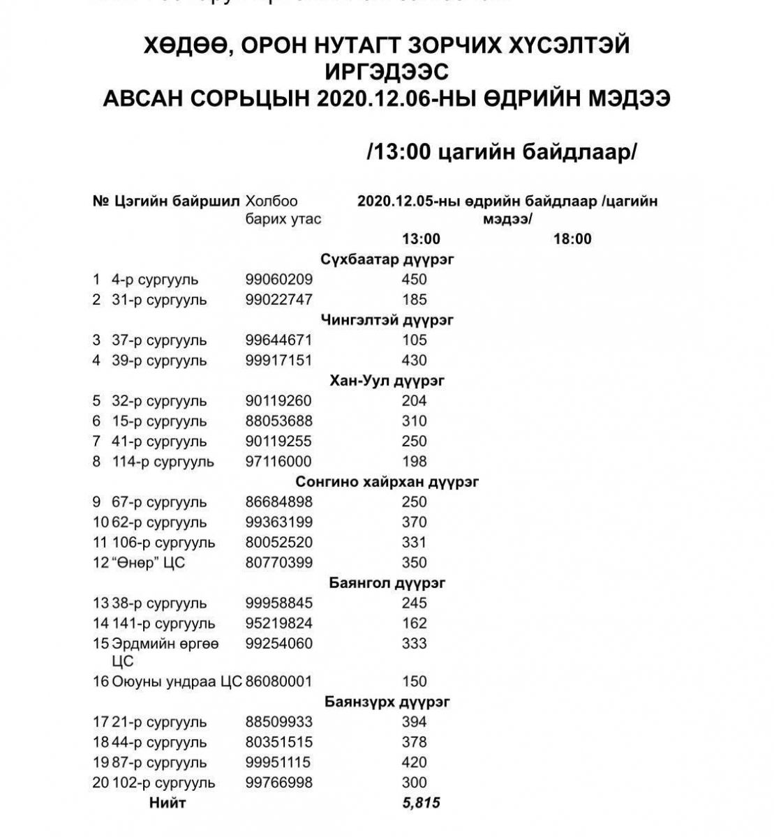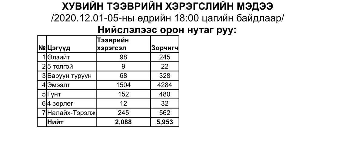 - 2020.12.01-ний өдөр Улаанбаатар хотоос орон нутаг руу 19 чиглэлд 78 тээврийн хэрэгслээр 2,580