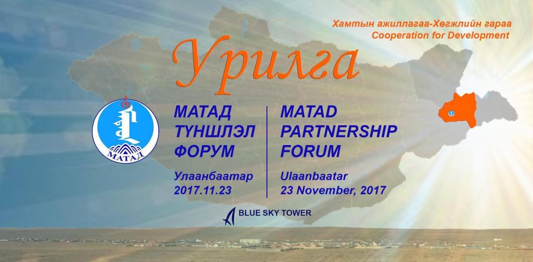 Дорнод аймгийн Матад сумын хөгжлийн чиг хандлагыг тодорхойлж, тус сумын хөгжлийн асуудалд төрийн болон төрийн бус байгууллага, иргэд, олон улсын байгуллагын анхаарлыг төвлөрүүлэн, хамтын ажиллагааг өргөжүүлж, үр өгөөжийг нь дээшлүүлэх зорилго бүхий “Матад түншлэл-2017” форумыг маргааш буюу энэ сарын 23-ны өдөр Улаанбаатар хотод зохион байгуулах гэж байна. Уг үйл ажиллагаа нь тухайлсан нэг сумын хөгжлийн асуудлыг олон улсын хэмжээнд тавин хэлэлцүүлж буй анхны форум гэдгээрээ онцлогтой юм.