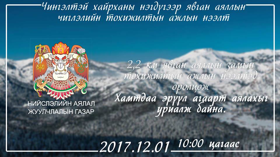 Тохижилтын нээлт арванхоёрдугаар сарын 1-ний 10:00 цагт болох тул та бүхнийг хүрэлцэн ирж тохижилтын ажилтай танилцан хамт цэвэр агаарт алхахыг урьж байна.