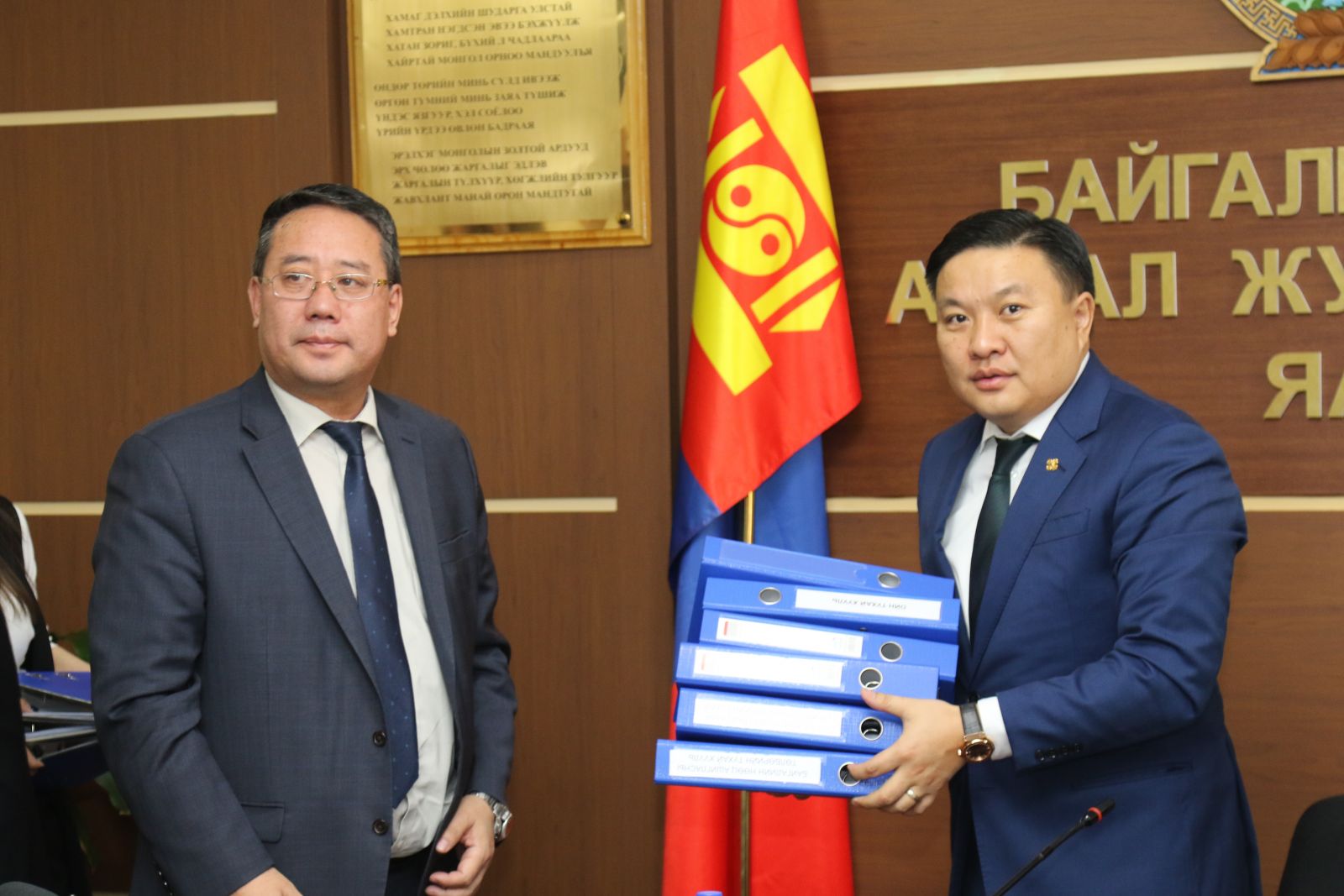 Байгаль орчин, аялал жуулчлалын сайд Н.Цэрэнбатад Хууль зүй, дотоод хэргийн яамны Төрийн нарийн бичгийн дарга Г.Баясгалан тэргүүтэй төлөөлөгчид Байгаль орчны салбарын тухай багц хуулийн төслийг хүлээлгэж өглөө. Энэ үйл ажиллагаанд Байгаль орчин, аялал жуулчлалын яамны Төрийн нарийн бичгийн дарга Ц.Цэнгэл, Төрийн захиргааны удирдлагын газрын дарга Х.Батжаргал, Аялал жуулчлалын бодлого зохицуулалтын газрын дарга С.Бат-Эрдэнэ, Ойн бодлого зохицуулалтын газрын дарга М.Тунгалаг, Газар зохион байгуулалт, усны нэгдсэн бодлого зохицуулалтын газрын дарга Ш.Мягмар, Тусгай хамгаалалттай нутгийн удирдлагын газрын дарга Ч.Батсансар, Хяналт шинжилгээ, үнэлгээ, дотоод аудитын газрын дарга Т.Алтангэрэл,Хуулийн хэлтсийн дарга Ч.Раднаабазар, Сав газрын удирдлагын хэлтсийн дарга Н.Баттулга, Цэвэр технологи, хөрөнгө оруулалт, үйлвэрийн хэлтсийн дарга Ц.Уранчимэг нар оролцсон юм.