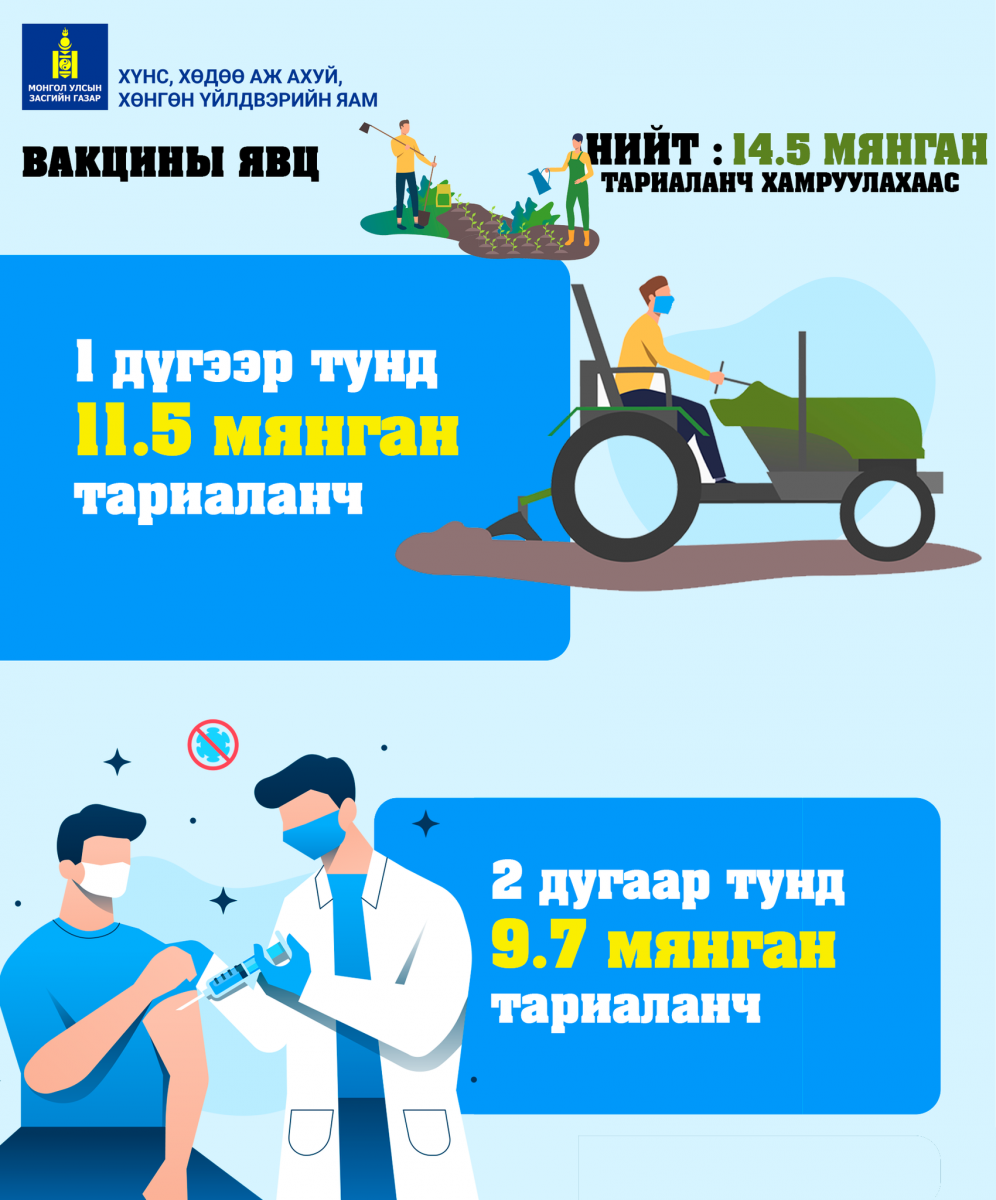 Орон даяар вакцинжуулалтын ажил эрчимтэй явагдаж байна. Хаврын тариалалтад ажиллах 14.5 мянган тариаланчийг вакцинжуулалтад хамруулахаар нэрсийг гаргаж УОК болон Эрүүл мэндийн яаманд хүргүүлж хамтран ажиллаж байна.