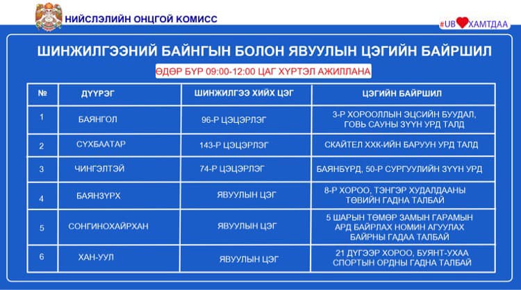 Нийслэлийн хэмжээнд 2021 оны зургаадугаар сарын 1-нээс 04-ний өдрүүдэд ажиллах PCR шинжилгээний цэгийн байршил, ажиллах цагийн хуваарийг хүргэж байна. Энэ хугацаанд өдөр бүр 09:00-12:00 цагийн хооронд ажиллана.
