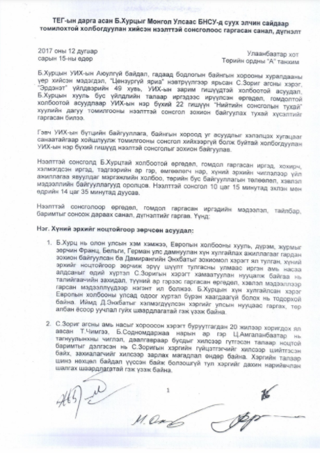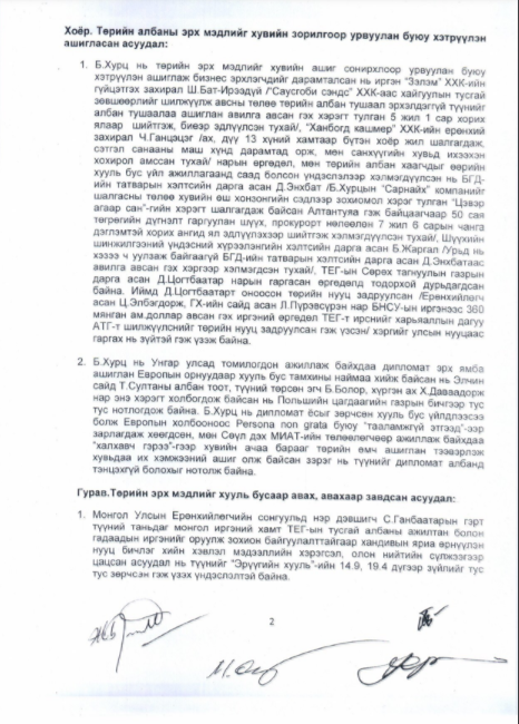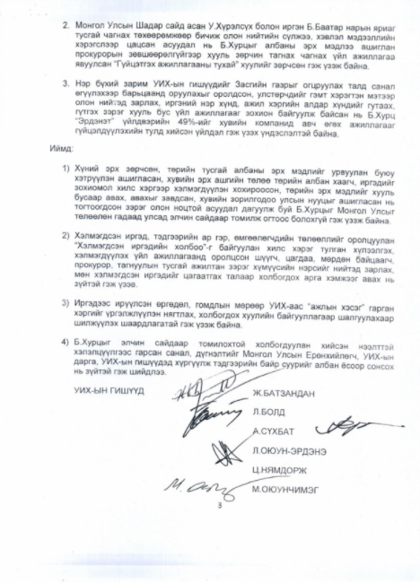 Санал дүгнэлтээ хүний эрхийг ноцтойгоор зөрчсөн асуудал, төрийн албаны эрх мэдлийг хувийн зорилгоор урвуулан буюу хэтрүүлэн ашигласан асуудал, төрийн эрх мэдлийг хууль бусаар авах, авахыг завдсан асуудал гэсэн гурван бүлэгт хуваан гаргажээ. Энэхүү санал дүгнэлтэд УИХ-ын гишүүн Ж.Батзандан, Л.Болд, Ц.Нямдорж, А.Сүхбат, Л.Оюун-Эрдэнэ, М.Оюунчимэг нар гарын үсэг зурсан байна. Эдгээр гишүүн нээлттэй хэлэлцүүлгээс гаргасан энэ дүгнэлтийг Ерөнхийлөгч Х.Баттулга, УИХ-ын дарга М.Энхболд болон УИХ-ын гишүүдэд хүргүүлж байр суурийг нь албан ёсоор сонсох нь зүйтэй гэж үзжээ.