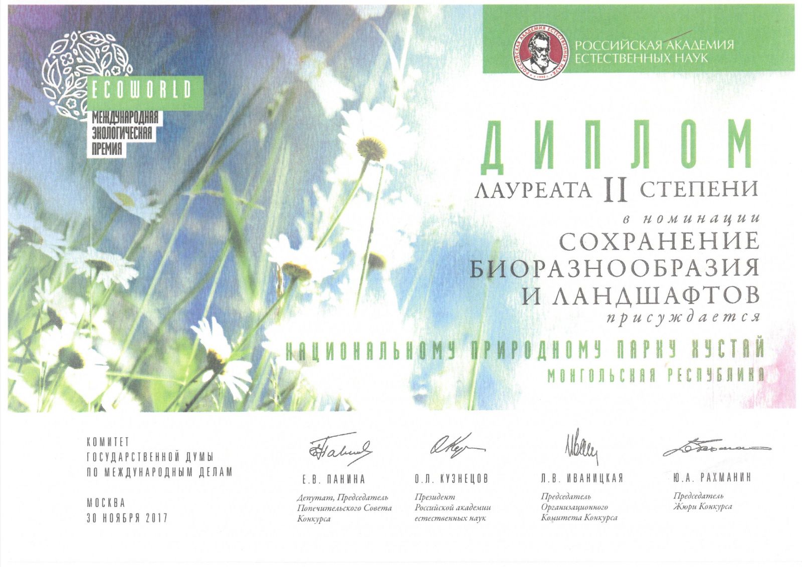 Түүний шагналыг “Эко Дэлхий” олон улсын экологийн шагналд нэр дэвшигчдийг шалгаруулах зөвлөлийн тэргүүн, эдийн засгийн ухааны доктор, профессор, ОХУ-ын төрийн думын гишүүн Е.В.Панина, Байгалийн шинжлэх ухааны академийн ерөнхийлөгч, техникийн шинжлэх ухааны доктор, профессор, О.Л.Кузнецов нар гардууллаа.