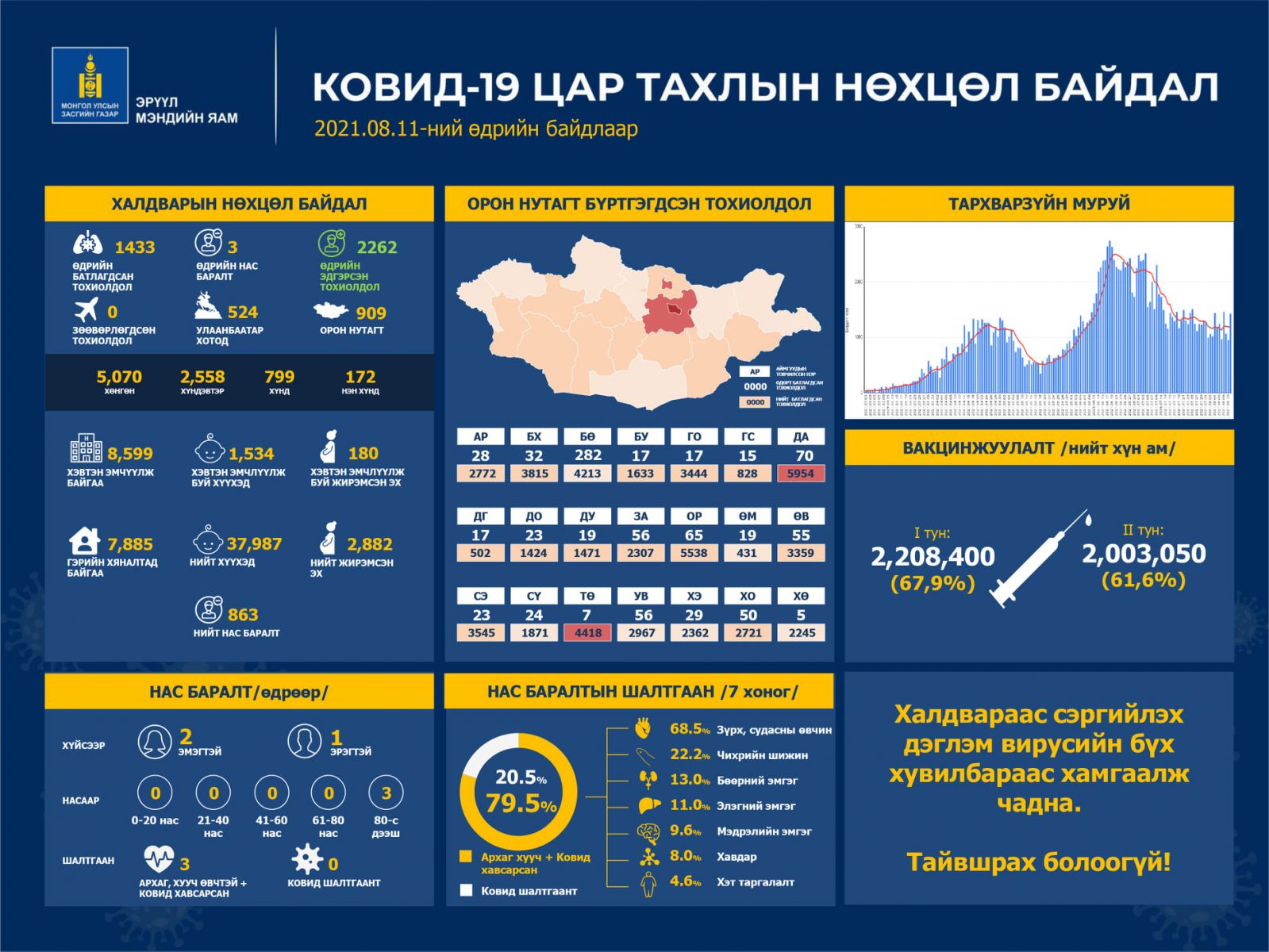 Сүүлийн 24 цагт коронавируст халдварын 1433 тохиолдол шинээр бүртгэгдэж, 2262 хүн эдгэрчээ. Мөн гурван хүн нас баржээ. Шинээр бүртгэгдсэн тохиолдлуудын 524 нь Улаанбаатар хотод, 909 орон нутагт байна.
