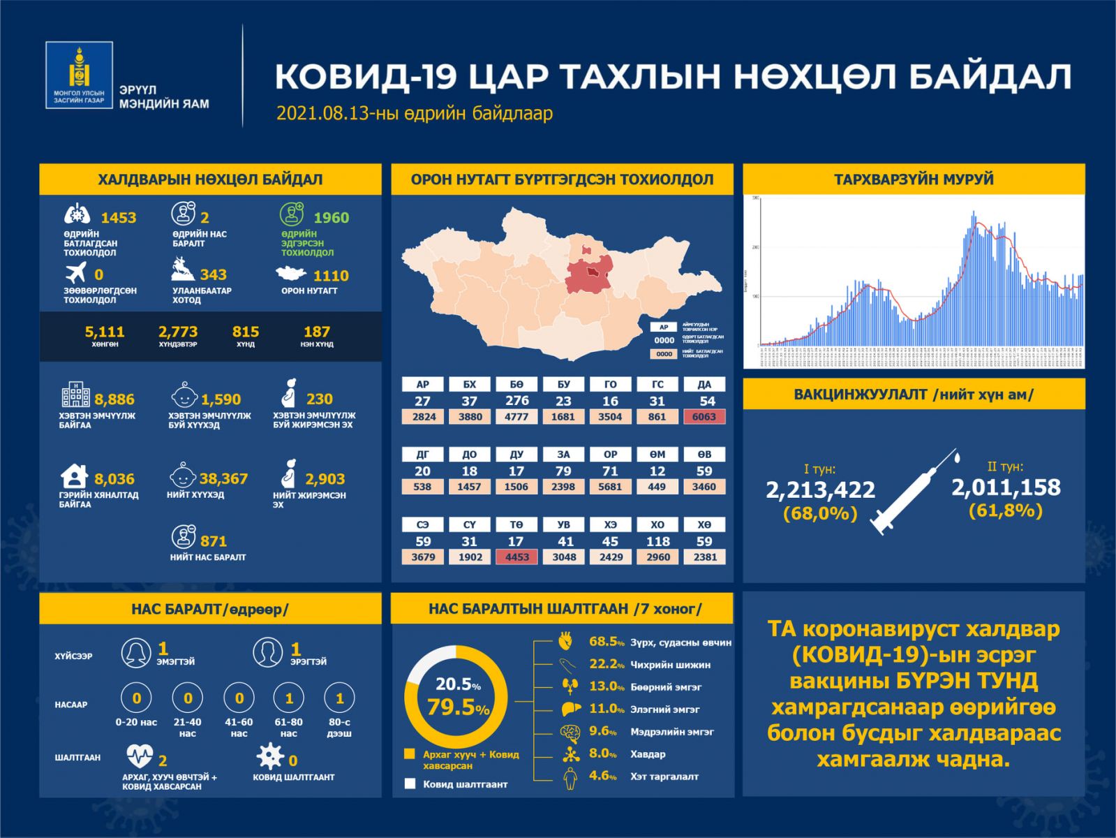 Эрүүл мэндийн яамнаас коронавирусийн халдварын нөхцөл байдлыг танилцууллаа. Сүүлийн 24 цагт 1452 хүнээс коронавирусийн халдвар илэрч, 1960 хүн эдгэрчээ. Мөн хоёр иргэн коронавирусийн халдварын улмаас амиа алдсан харамсалтай тохиолдол бүртгэгджээ. Энэхүү хоёр тохиолдол нь орон нутагт бүртгэгдсэн бөгөөд Улаанбаатарт нас баралт бүртгэгдээгүй байна.