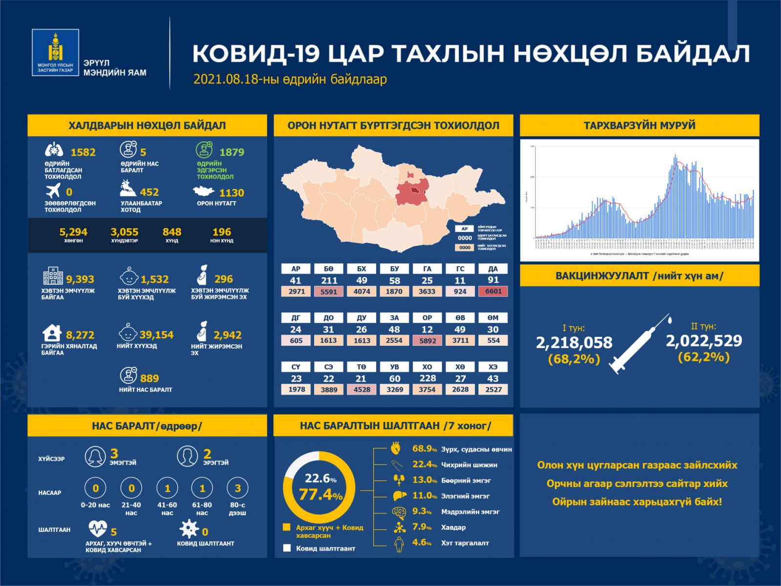 Сүүлийн 24 цагт коронавируст халдварын 1582 тохиолдол шинээр бүртгэгдэж, 1879 хүн эдгэрчээ. Мөн таван хүн нас барсан байна. Шинээр бүртгэгдсэн тохиолдлуудын 452 нь Улаанбаатар хотод, 1130 нь орон нутагт байна.