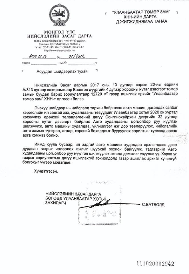 Нийслэлийн Засаг дарга бөгөөд Улаанбаатар хотын Захирагч С.Батболд өнөөдөр “Улаанбаатар төмөр зам” ХНН-ийн дарга Д.Жигжиднямаад хандан асуудал шийдвэрлэх тухай албан бичиг хүргүүллээ.