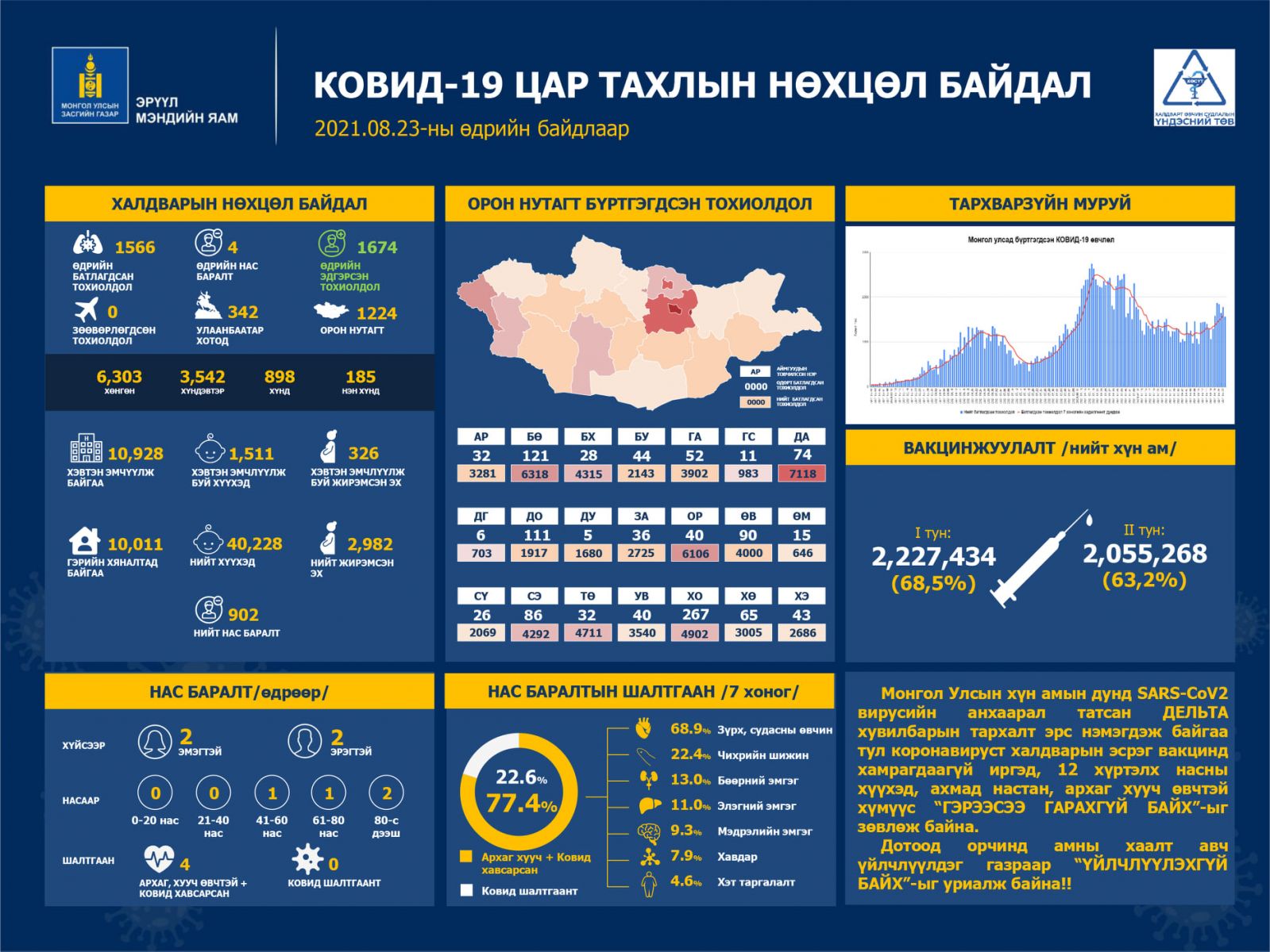 Сүүлийн 24 цагт коронавируст халдварын 1566 тохиолдол шинээр бүртгэгдэж, 1674 хүн эдгэрчээ. Коронавируст халдварын улмаас 4 хүн нас барсан байна. /2021.08.23/