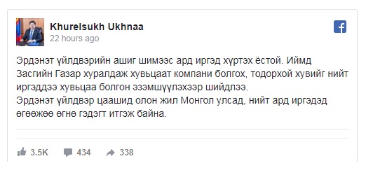 "Эрдэнэт" үйлдвэрийг нээлттэй хувьцаат компани болгож 10 хувийг нь иргэдэд үнэ төлбөргүй эзэмшүүлэх Засгийн газрын шийдвэртэй холбогдуулан Ерөнхий сайд У.Хүрэлсүх өөрийн цахим хуудсаараа дамжуулан байр сууриа илэрхийлжээ. Тэрээр "Эрдэнэт үйлдвэрийн ашиг шимээс ард иргэд хүртэх ёстой. Иймд Засгийн газар хуралдаж хувьцаат компани болгох, тодорхой хувийг нийт иргэддээ хувьцаа болгон эзэмшүүлэхээр шийдлээ. Эрдэнэт үйлдвэр цаашид олон жил Монгол Улсад, нийт ард иргэдэд өгөөжөө өгнө гэдэгт итгэж байна" гэжээ.