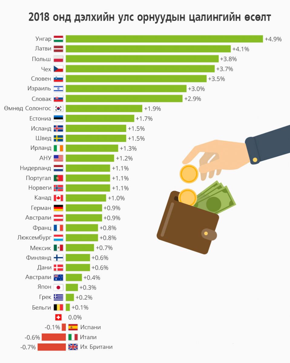 Та бүхэндээ маш сонирхолтой нэгэн статистикийг хүргэж байна. Лондонд төвтэй "Trades Union Congress" хэмээх байгууллага Европын харилцаа, хамтын ажиллагааны байгууллагын гишүүн орнуудад 2018 онд цалин хөлс хэдий хэмжээгээр нэмэгдэж байгааг судлан мэдээлэл бэлтгэжээ. Европтоо хөгжлөөр харьцангуй сул гэж тооцогддог Зүүн Европын Унгар, Польш, Чех, Ловак, Словен зэрэг улсуудад цалин хамгийн өндөр хувиар өсөх нь тодорхой болсон байна.