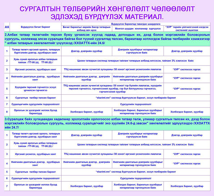 Татвар төлөгч иргэн сургалтын төлбөрийн болон орон сууцны хөнгөлөлт, чөлөөлөлтийн материалаа иргэний харъяаллын дагуух Татварын албанд ирүүлнэ.