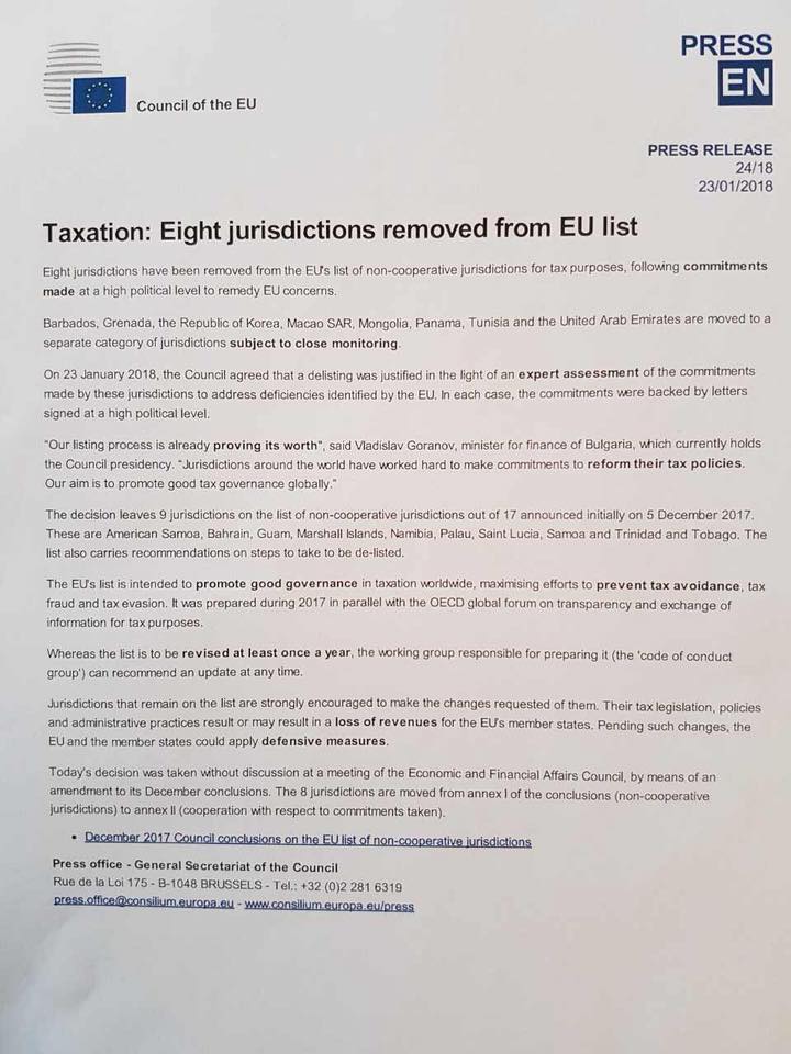 Европын Холбооны гишүүн орнуудын Сангийн сайд нарын Зөвлөл 2018 оны нэгдүгээр сарын 23-ны өдөр Брюссель хотноо хуралдаж, “татварын асуудлаар хамтран ажилладаггүй орнуудын жагсаалтаас” Монгол Улсыг гаргахаар шийдвэрлэв.