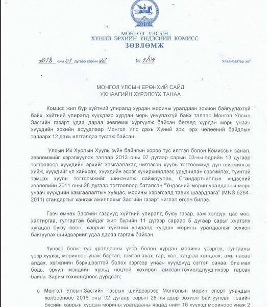 Монгол Улсын Хүний эрхийн Үндэсний Комиссоос хүйтний улиралд хурдан морины уралдаан зохион байгуулахгүй байх, хүйтний улиралд хүүхдээр хурдан морь унуулахгүй байх талаар Монгол Улсын Засгийн газарт зөвлөмж хүргүүлжээ.