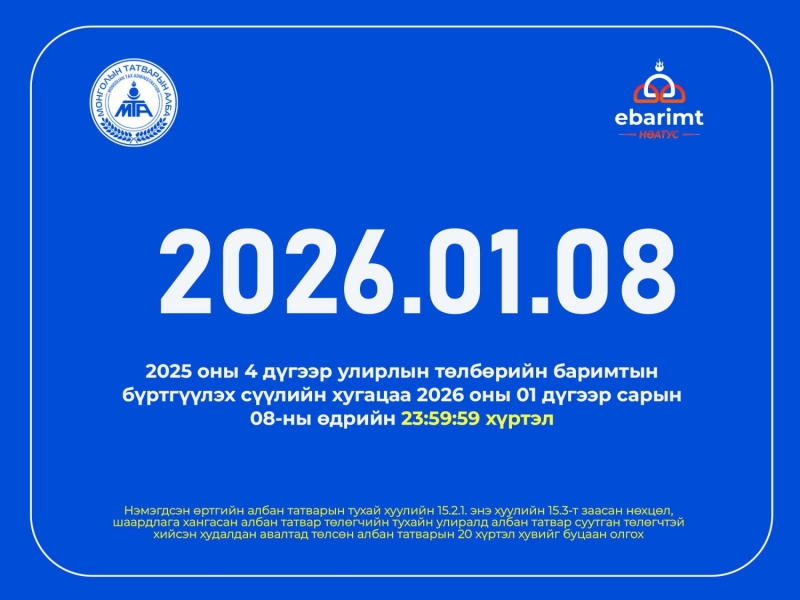 2025 оны дөрөвдүгээр улирлын төлбөрийн баримтаа 2026 оны нэгдүгээр сарын 8-ны 23:59:59 цагаас өмнө амжиж бүртгүүлэн НӨАТ-ын буцаан олголтын урамшууллаа авна.